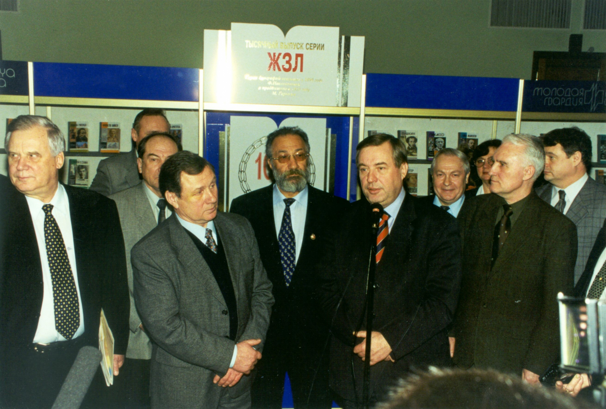 2001 год. Выставка книг «Молодой гвардии» в Госдуме, организованная в связи с выходом тысячного тома серии «ЖЗЛ». Николай Рыжков, директор «Молодой гвардии» в 1985—2022 годах Валентин Юркин, Артур Чилингаров, Геннадий Селезнев, Геннадий Аксенов