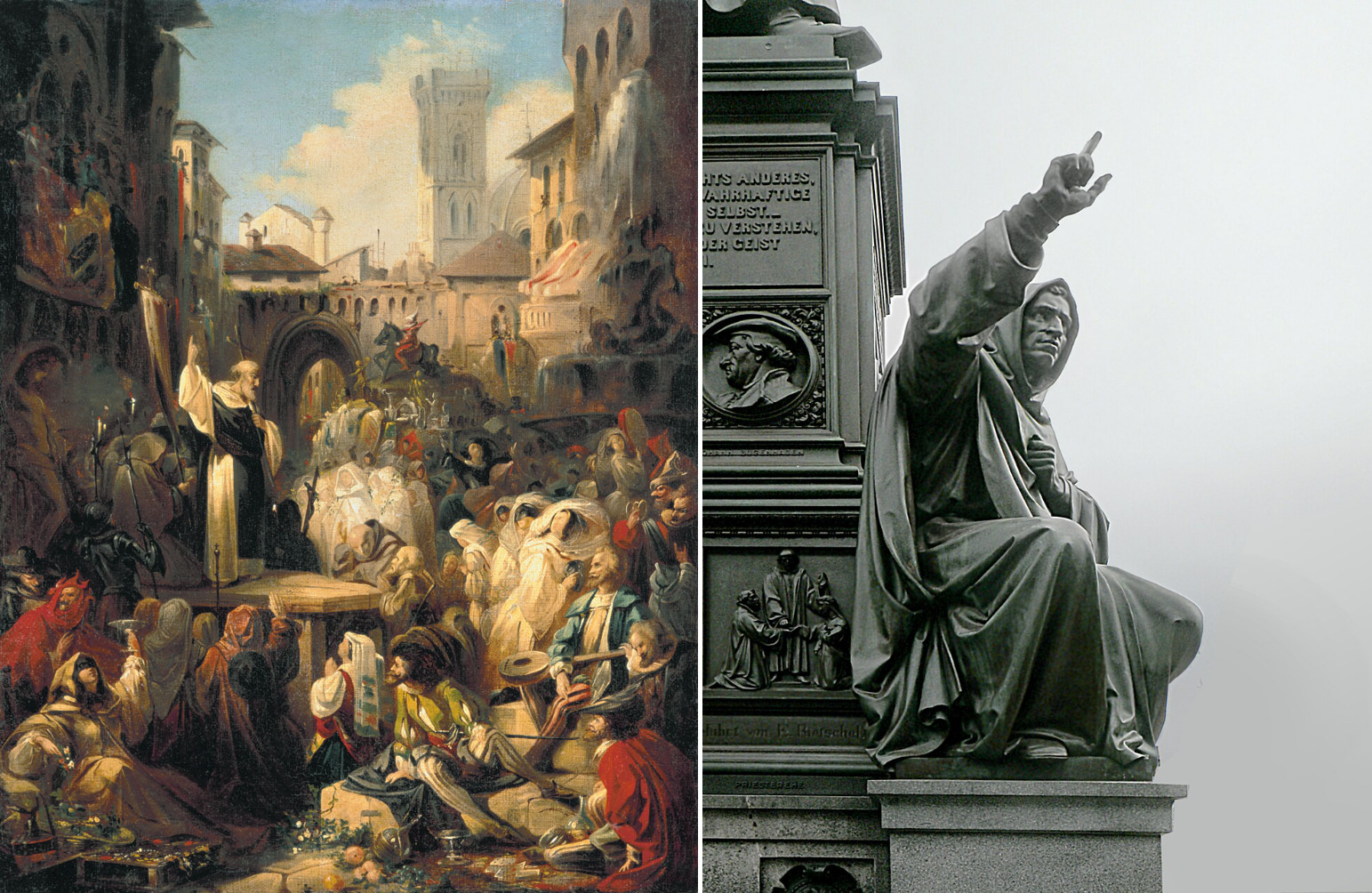 Слева: Проповедь Савонаролы во Флоренции (Николай Ломтев, 1850-е годы). Справа: Савонарола проповедующий. Деталь памятника Лютеру. Вормс