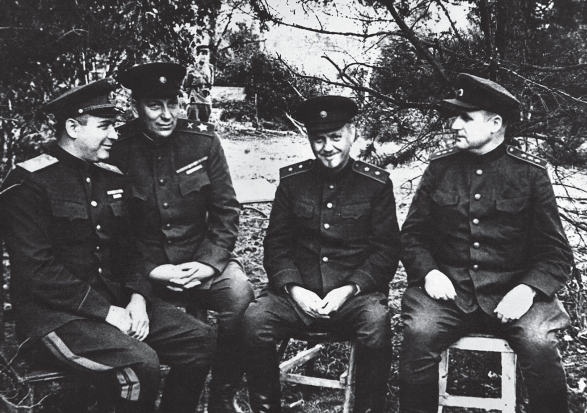 Маршал авиации А. А. Новиков, маршал артиллерии Н. Н. Воронов, генерал-лейтенант Н. А. Булганин, генерал-полковник В. Д. Соколовский. 1943 год